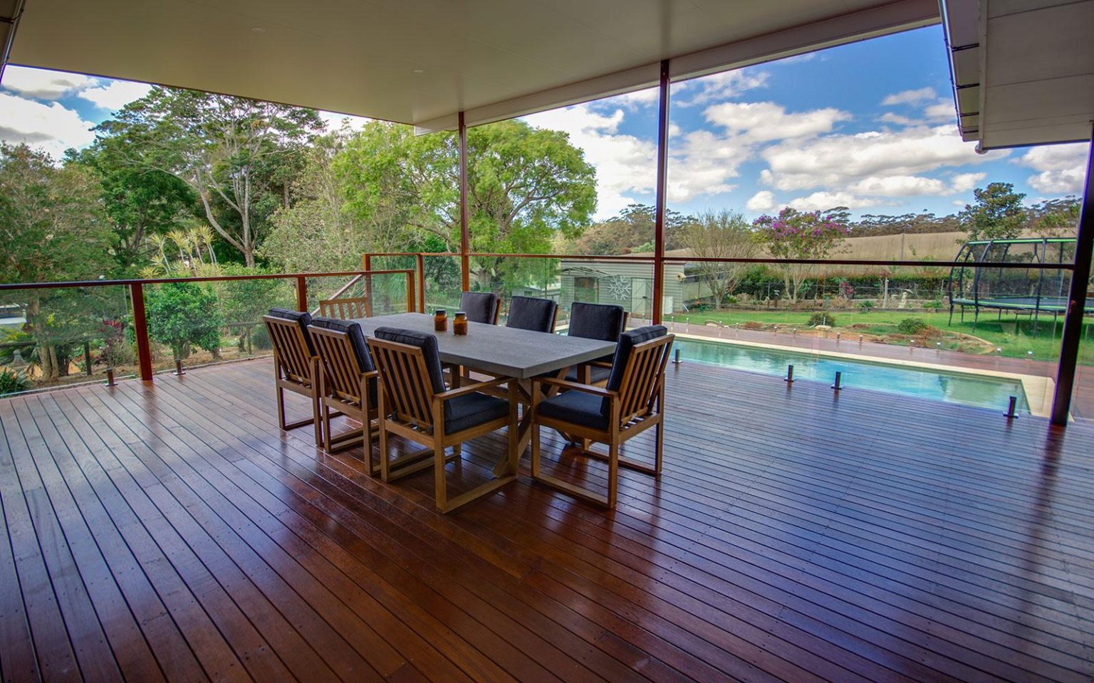 The large upper timber deck over looks the beautiful pool deck below. It has a high flyover insulated patio roof, which allows plenty of natural night and ventilation. It is a wonderful outdoor area for meals and entertaining, or just keeping an eye on the kids in the pool below.